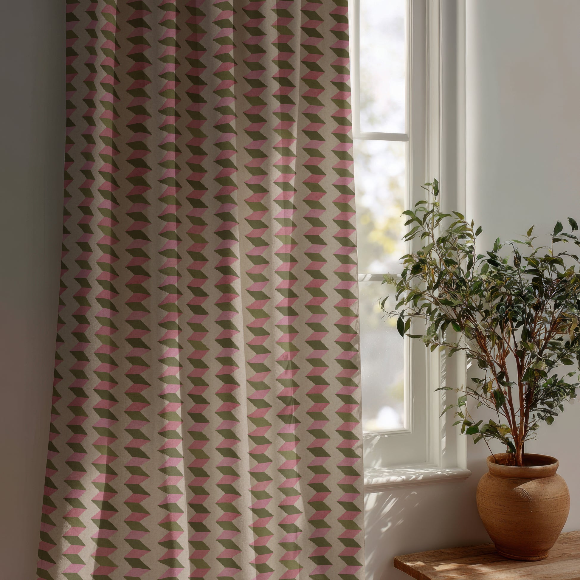 Reimagines the classic stripe with an optical twist. The name is inspired by the tessellated illusions of M.C. Escher (1898 - 1972), angled bands form a rhythmic zigzag that shifts between dimension and flow. The clean geometry is softened by subtle textures and a floral palette. whether used as a feature wall or across an entire space, it creates playful movement, & depth.