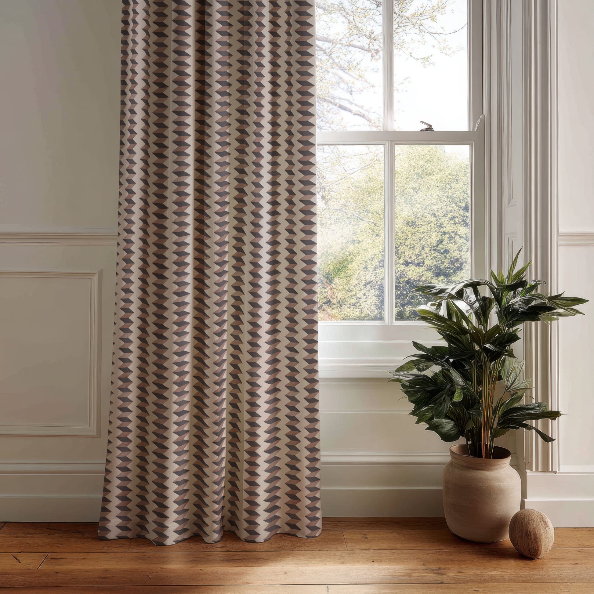 Reimagines the classic stripe with an optical twist. The name is inspired by the tessellated illusions of M.C. Escher (1898 - 1972), angled bands form a rhythmic zigzag that shifts between dimension and flow. The clean geometry is softened by subtle textures and a floral palette. whether used as a feature wall or across an entire space, it creates playful movement, & depth.
