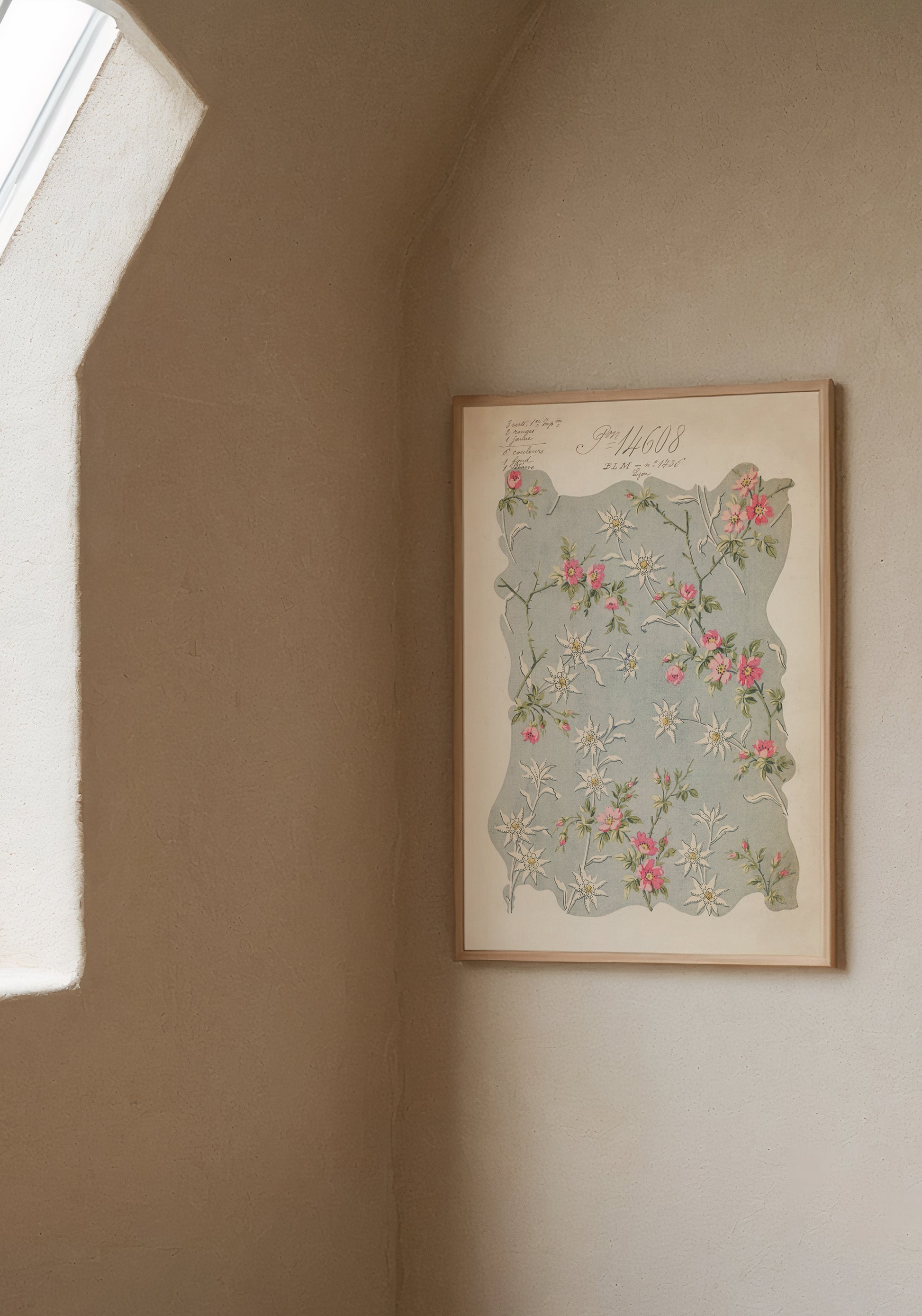 Above, faint handwritten notes and numbers drift like echoes of a forgotten artisan's touch, adding an air of mystery and reverence to this ethereal masterpiece. The designs cataloging information and irregular block printed edge reveal the craftsmanship of this precious sample from a bygone era.