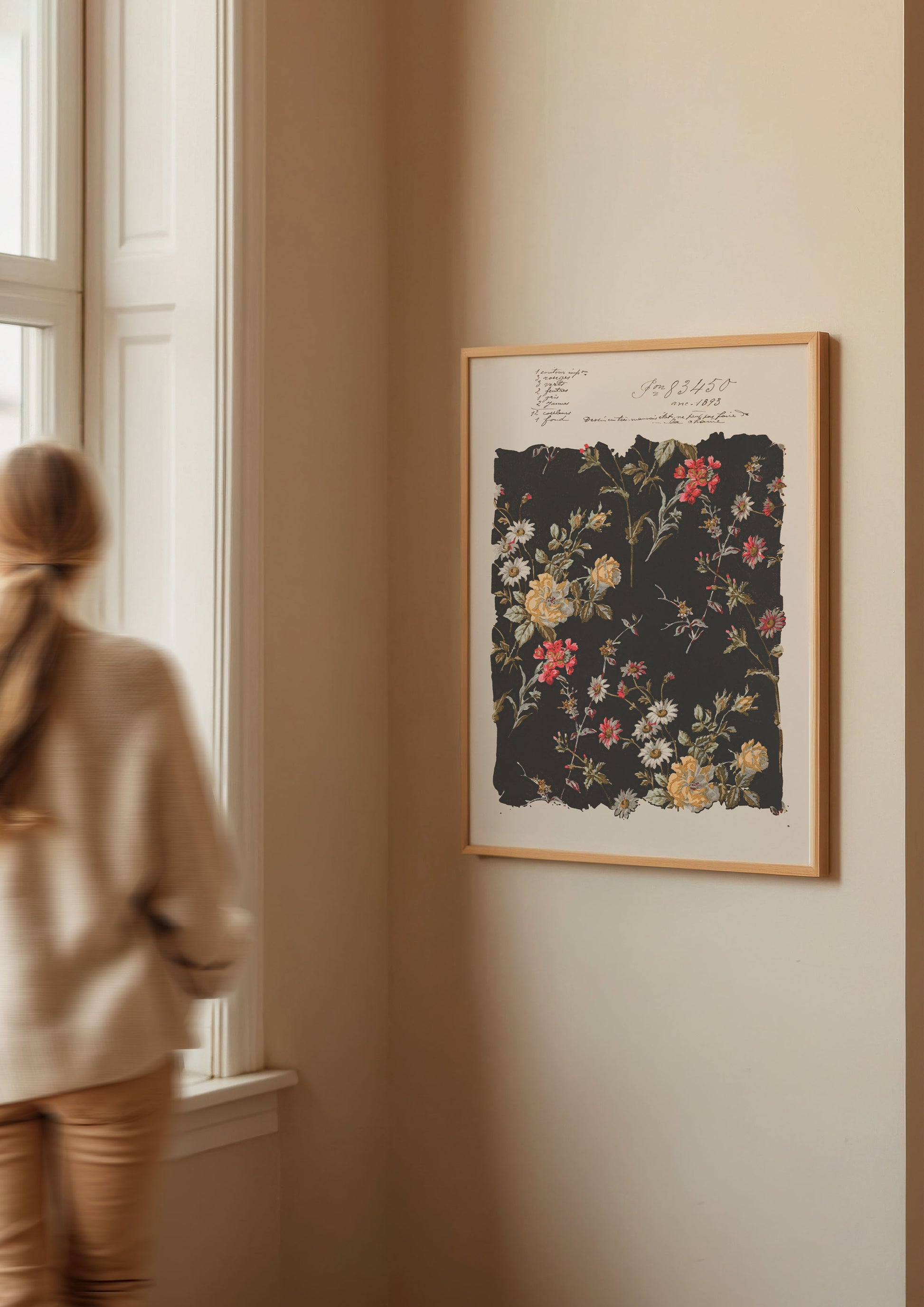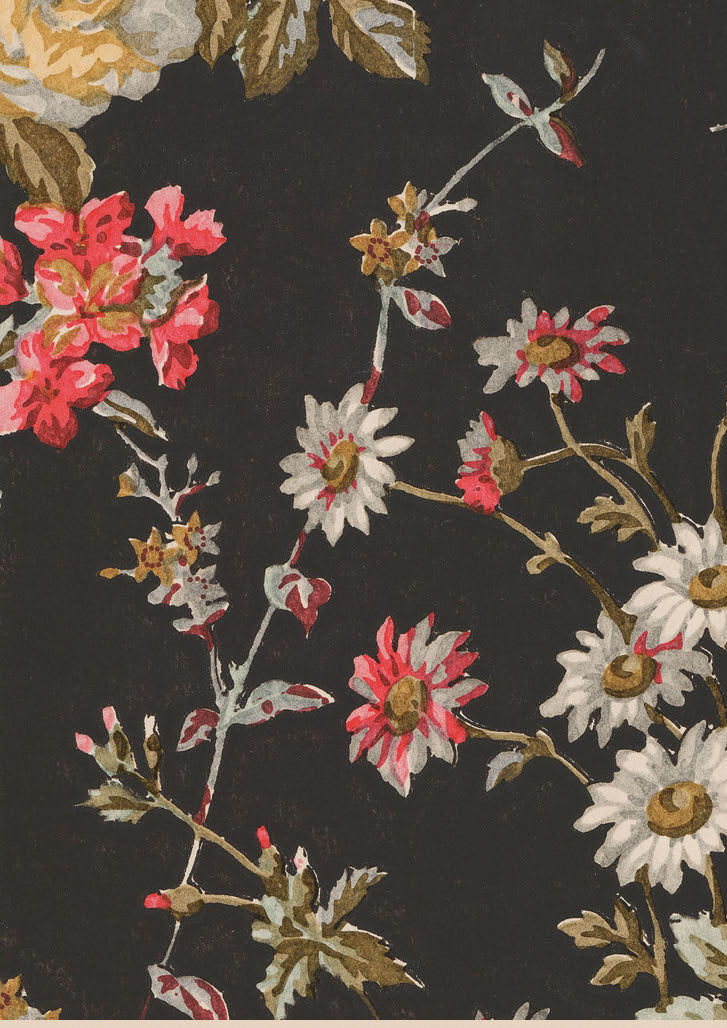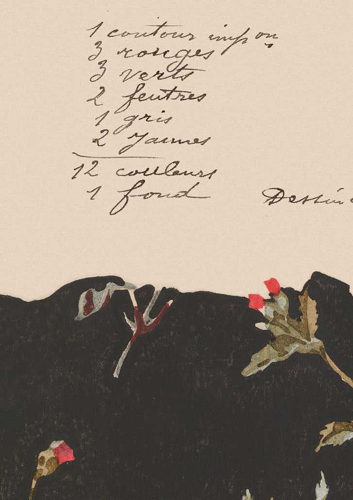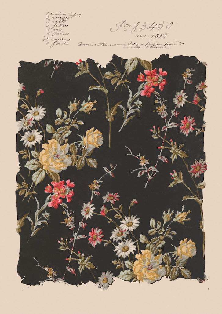 A beautifully preserved textile design from 1893 showcases a dark backdrop adorned with intricate botanical artistry. Handwritten archival annotations in French lend authentic historical significance, highlighting the meticulous craftsmanship and timeless elegance of the artwork.